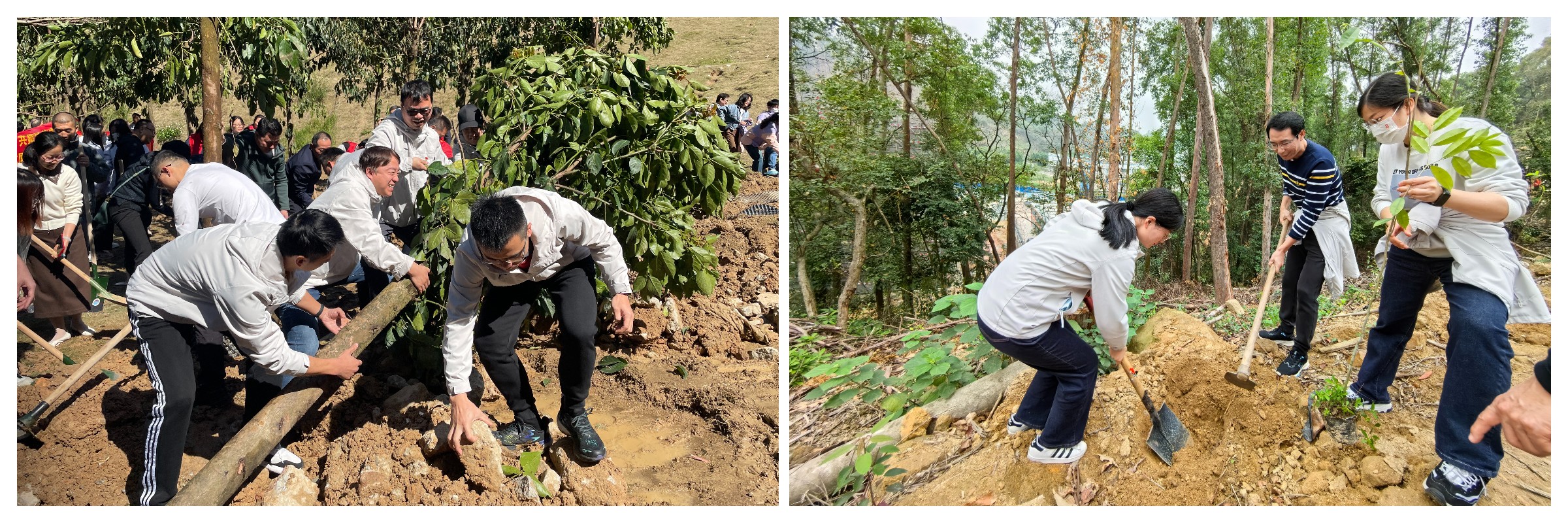 活動現(xiàn)場,黨員們?nèi)宄山M、分工合作,大家拿起工具,配合默契、干勁十足,揮鍬鏟土、扶樹填土、踩實(shí)修整、圍堰澆水……每一個步驟都井然有序,現(xiàn)場呈現(xiàn)出一派熱火朝天的勞動場面。經(jīng)過一番辛勤努力,火力楠、土沉香、降香黃檀、閩南、鐵冬青、山杜英等一棵棵新樹、一株株新苗在春風(fēng)中錯落有致,在和煦的陽光下展現(xiàn)蓬勃生機(jī),為這片綠意盎然的土地增添了新的生機(jī)與活力。