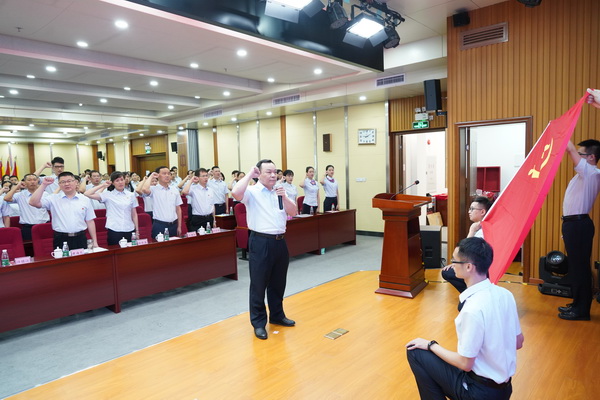 大會在莊嚴(yán)的國歌聲中拉開了序幕。在黨委書記許鎮(zhèn)江的帶領(lǐng)下,全體黨員起立,面向黨旗,舉起右手,莊嚴(yán)宣誓,重溫了入黨誓詞。