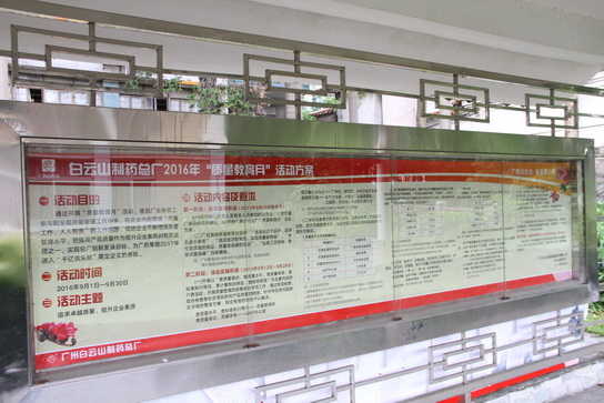 金秋9月,秋風(fēng)送爽。白云山制藥總廠大院內(nèi)處處都能感受到質(zhì)量教育的氣息:在職工食堂的主要通道宣傳欄張貼的《2016年“質(zhì)量教育月”活動(dòng)方案》,內(nèi)容具體,思路清晰,切實(shí)可行;廠區(qū)主干道掛著“信譽(yù)來(lái)源于品質(zhì)、品質(zhì)來(lái)源于素質(zhì)”,“適應(yīng)經(jīng)濟(jì)新常態(tài)、實(shí)現(xiàn)質(zhì)量新跨越”,“責(zé)任是質(zhì)量的保證、質(zhì)量是品牌的生命”,“弘揚(yáng)工匠精神、勇攀質(zhì)量高峰” 四條宣傳橫幅,橫幅格外鮮亮、注目。