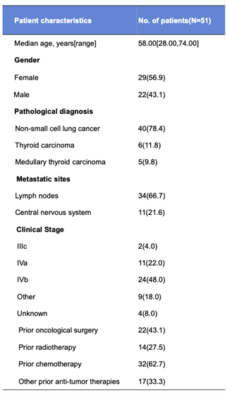 入組患者既往接受過手術(shù)、放療或化療治療,其中,78.4%(n=40)的患者為NSCLC患者,男性與女性患者比例相近,21.6%(N=11)的患者出現(xiàn)CNS轉(zhuǎn)移[1]。