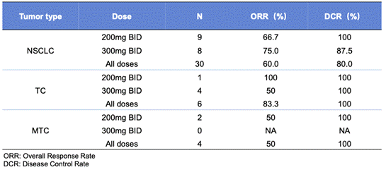在40例可評(píng)估的患者中,獨(dú)立審查委員會(huì)根據(jù)RECIST v1.1確認(rèn)的總緩解率(ORR)和疾病控制率(DCR)分別為62.5%和85%。其中,RET融合NSCLC(n=30)、TC患者(n=6)、MTC患者(n=4)的ORR/DCR分別為60%/80%、83.3%/100%和50%/100。而IRC在 200mg和 300mg(BID)的劑量組中所測定的ORR和DCR分別為 66.7%/100% 和 75%/91.7%[1]。