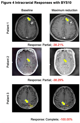 研究人員在4例至少有1個(gè)可測量顱內(nèi)病灶(1例顱內(nèi)完全緩解)的患者中觀察到顱內(nèi)抗腫瘤活性。