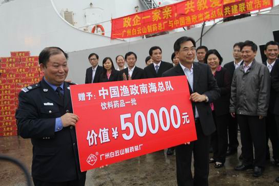 2012年11月21日,廣藥集團(tuán)廣州白云山制藥總廠與中國(guó)漁政南??傟?duì)在中國(guó)漁政南??傟?duì)310漁政船上,共同開(kāi)展了以“政企一家親,共敘愛(ài)國(guó)情”為主題的共建聯(lián)誼活動(dòng)。中國(guó)南海區(qū)漁政局副局長(zhǎng)郭富錦、副巡視員(總隊(duì)長(zhǎng))朱英榮、廣藥集團(tuán)副總經(jīng)理、白云山總廠廠長(zhǎng)陳矛,白云山總廠黨委書(shū)記周志魁等領(lǐng)導(dǎo)以及雙方單位干部及員工約130人參加了本次活動(dòng)。