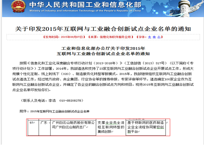 近日,國家工業(yè)和信息化部公布了全國100家“2015年互聯(lián)網(wǎng)與工業(yè)融合創(chuàng)新試點企業(yè)名單”,白云山制藥總廠榜上有名,成為廣東省9家入選企業(yè)之一。這是白云山制藥總廠實施創(chuàng)新驅(qū)動戰(zhàn)略的重要成果之一,標志著白云山制藥總廠在互聯(lián)網(wǎng)與工業(yè)融合方面躋身行業(yè)和全國企業(yè)前列,也是總廠繼榮獲“廣東省信息化和工業(yè)化融合示范企業(yè)”、2014年首批全國502家“兩化融合管理體系貫標試點示范企業(yè)”、“全國信息化建設優(yōu)秀單位”之后的又一重要榮譽,意義重大。